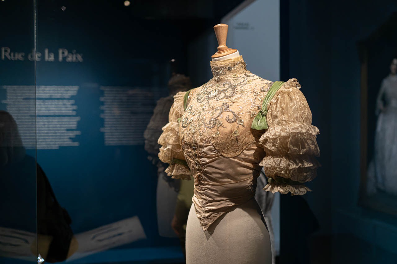 繊細な照明に包まれた展示室では、1860年代のドレスが静かに並び、当時のエレガンスが空間全体に漂う。厚みのある絹やチュールの質感、広がるスカートのシルエットが、ガラス越しに見る者の想像力をかき立てる。衣服が語る物語に耳を澄ませるように、来場者たちは一着一着に見入っていた。