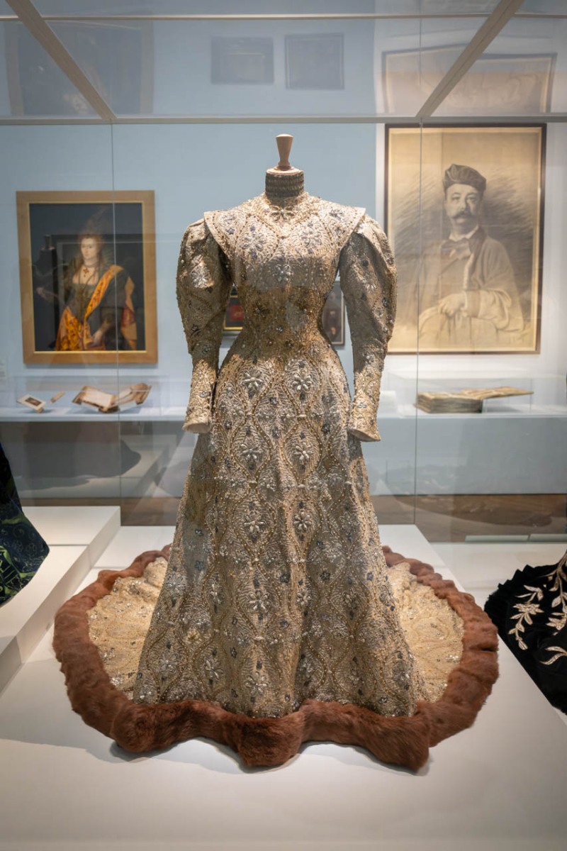 繊細な照明に包まれた展示室では、1860年代のドレスが静かに並び、当時のエレガンスが空間全体に漂う。厚みのある絹やチュールの質感、広がるスカートのシルエットが、ガラス越しに見る者の想像力をかき立てる。衣服が語る物語に耳を澄ませるように、来場者たちは一着一着に見入っていた。