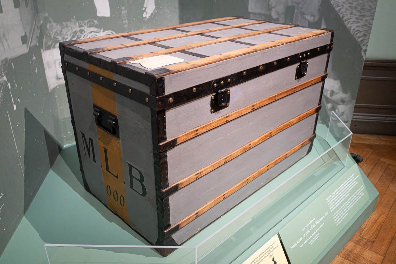 1882年、ルイ・ヴィトンによって製作されたこのトランクは、「7 rue de la Paix, Paris」のラベルが貼られ、オートクチュールの衣装をボストンへ輸送するために用いられたもの。表面はグリ・トリアノンと呼ばれる淡い灰色のキャンバス地で覆われ、真鍮や木製の補強により堅牢性が高められている。側面に記された「M.L.B.」のイニシャルは、依頼主とされるアメリカ人女性、Mrs. Beebe のもので、彼女は当時のボストン有数の商業一家に属していた。顧客の要望に応じて仕立てられたこの一点ものは、パリのアトリエと海外の顧客を繋いだ証でもある。