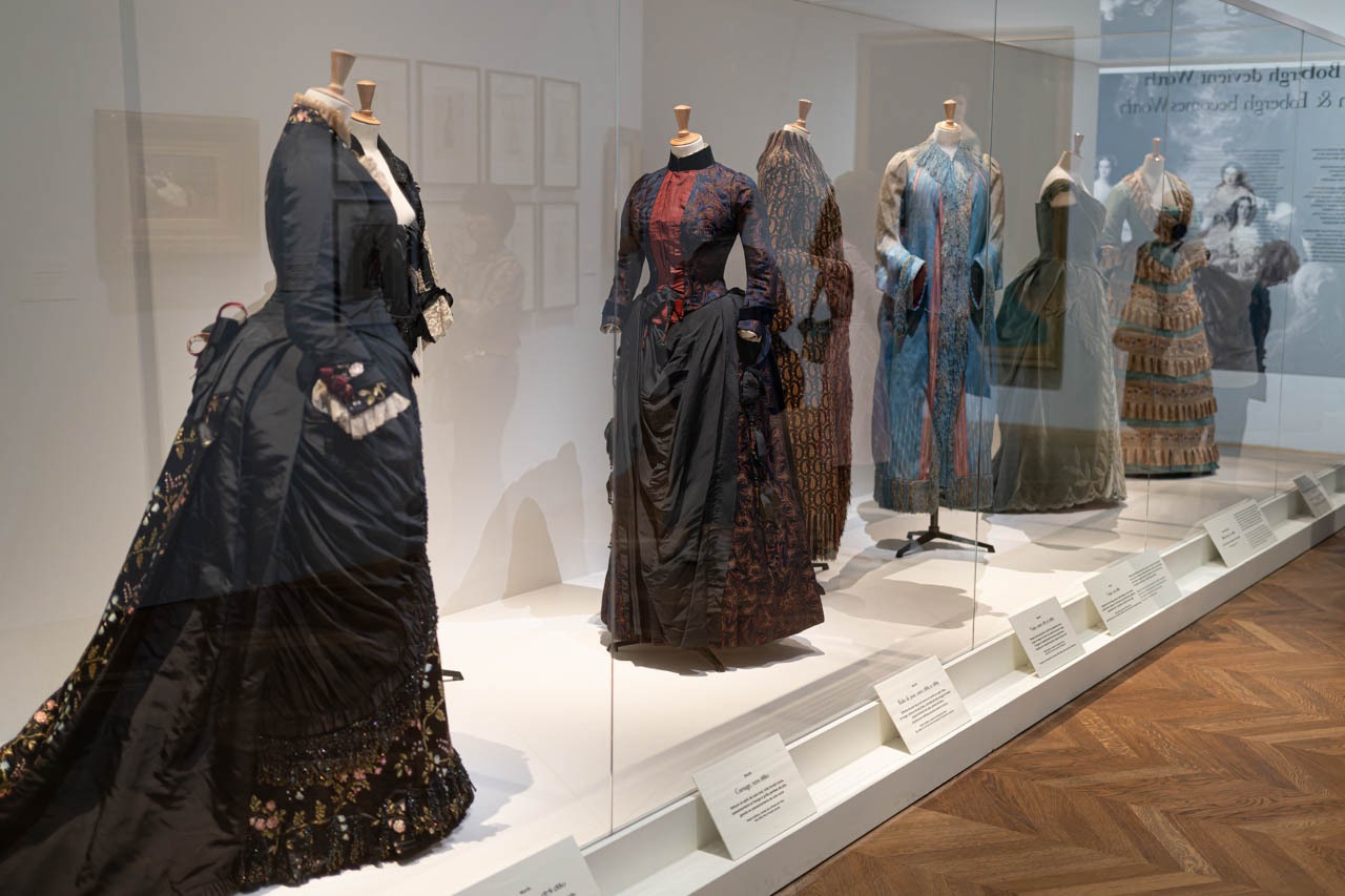 繊細な照明に包まれた展示室では、1860年代のドレスが静かに並び、当時のエレガンスが空間全体に漂う。厚みのある絹やチュールの質感、広がるスカートのシルエットが、ガラス越しに見る者の想像力をかき立てる。衣服が語る物語に耳を澄ませるように、来場者たちは一着一着に見入っていた。