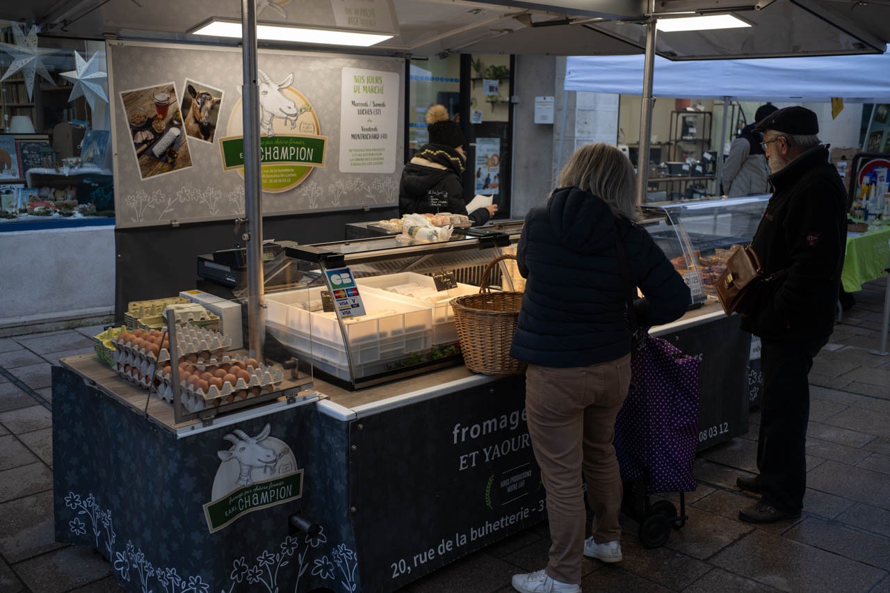 ロッシュの建築を支える白い石灰岩(トゥーファ)は、同時に豊かな牧草地を育む母岩でもある。その土壌のミネラルが凝縮されたのが、このシェーブル(山羊)チーズだ。 看板にある「Fermier(農家製)」の表記は、飼育から製造、そしてこのマルシェでの販売までを、一貫して自らの手で行う職人の証である。 巨大な石の歴史の足元で、生産者から直接手渡される「白い糧」。それは、この土地の地質と時間を食すことに他ならない。