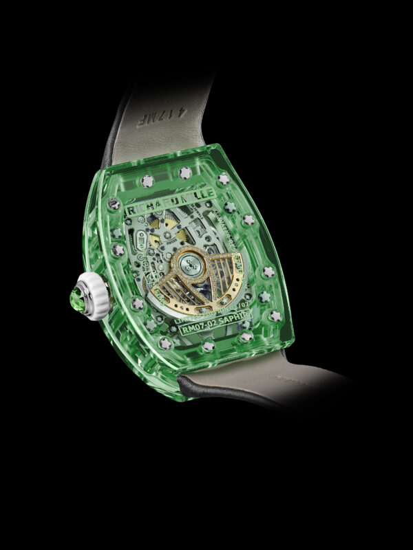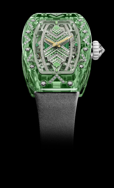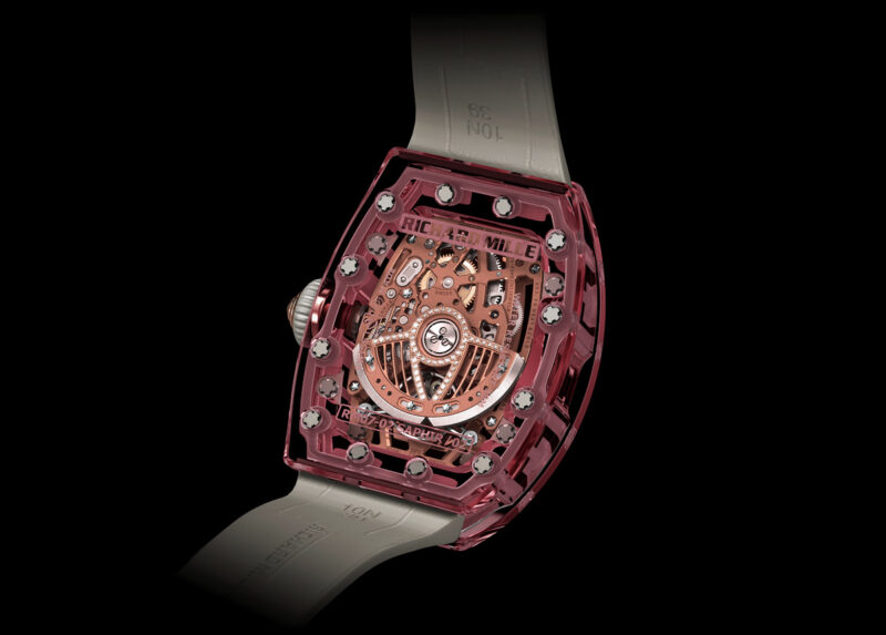 サファイアクリスタルはダイヤモンドに次ぐモース硬度9の素材であり、リシャール・ミルウォッチ特有の人間工学に基づいた、フィット感の高いスムースなケースに仕上げるには、1000時間以上にもわたる機械加工と仕上げの時間が要されることとなる。研磨だけでも350時間がかかる滑らかなフォルムに、グリーンとピンクのモデルにおいては、ダイヤモンドの瑞々しい輝きが添えられることとなった。