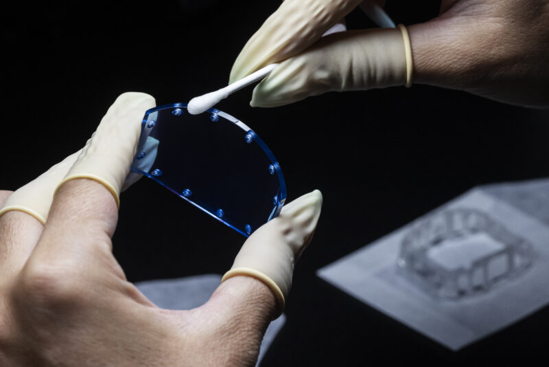 セッティングに採用されたのは、“ミトレイヤージュ”の技法。石を留めるためにゴールドのプロング(爪)を挿入するこのミトライヤージュはこれまでもリシャール・ミルのカーボンTPT®やセラミックモデルにも用いられてきた。ミクロン単位でのレーザー加工でサファイアクリスタルに直径0.25mmの下穴を施し、プロングを挿入するには従来よりも2倍以上の時間が要されたという。そうして生み出されたグラフィカルなダイヤモンドのラインは、透明感あふれるサファイアクリスタルケースと響き合うことで、見事な輝きの相乗効果を生み出すこととなった。