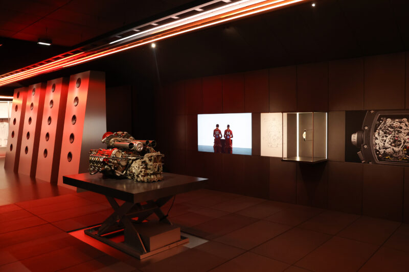 次の部屋ではエンジニア自らが、4年間かけて開発した新型ムーブメントCal.RM43-01を解説。エネルギーマネージメントを重視して、パワーリザーブ表示とトルクインジケーターを採用。ムーブメントのパーツも、フェラーリエンジンからインスピレーションを得たデザインを取り入れる。エンジンパーツと同様にブリッジにリブを入れることでパーツ強度を高めるのも、コラボレーションモデルらしい特徴だ。