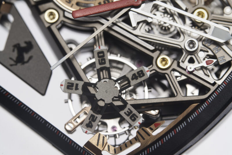 2022年にリシャール・ミル×フェラーリのコラボレーション第一弾モデルとなる「RM UP-01」が発表されたが、実際にはこのモデルの開発はかなり前から進んでいたため、フェラーリ側のかかわりはそれほど深くなかった。だからこそ“360度のパートナーシップ”だと胸を張る第二弾モデル「RM 43-01 トゥールビヨン スプリットセコンドクロノグラフ フェラーリ」は、フェラーリ濃度を高めた充実のコラボレーションモデルとなった。