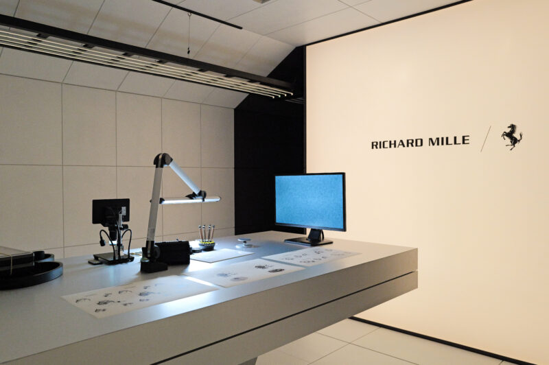 次の部屋はデザイン部門。「RM 43-01 トゥールビヨン スプリットセコンドクロノグラフ フェラーリ」では、時計のデザインを考える前に、まずはスピットフォームという抽象的なオブジェを制作して、ノイズのないピュアなコンセプトをまとめる手法をとった。これは時計と自動車という異なるプロダクトを基盤とする二社がコラボレーションしていくうえで、進むべき方向を見定める重要な工程となる。