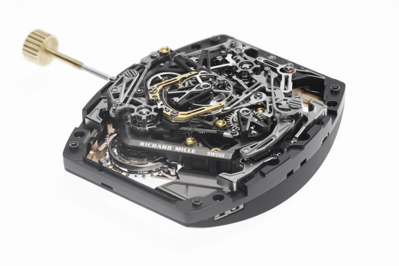 ちなみに時計ケースは、カーボンTPT®とチタンの二種類があるが、ケースの重さや素材によって、ムーブメントへの衝撃の加わり方が異なるため、カーボンTPT®モデルの場合はトゥ-ルビヨンを支えるブリッジにネジがひとつ追加されている。こういった効果的なディテールを積み重ねることで、耐衝撃性能に優れた時計に仕上げていくのだ。