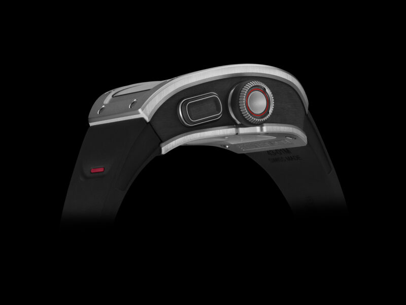 クロノグラフとスプリットセコンドの針を操作するためのプッシュボタンは、フェラーリの原点であるレース部門、スクーデリア・フェラーリの90周年を記念したハイブリッド・スーパーカー「SF90ストラダーレ」のリアライトの形状からインスピレーションを得ている。磨かれたチタンとカーボンTPT®を組み合わせたボタンの造形美はため息モノ。ここまで手の込んだプッシュボタンはこれまでに見たことがない。