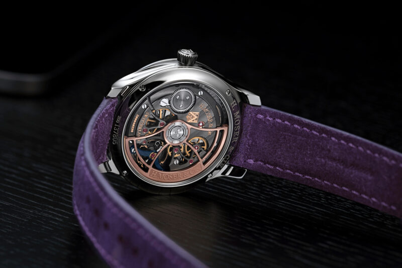 心臓部で時を刻むのは、100%スイス製の自社製機械式ムーブメント、キャリバー HMC 201だ。この自動巻きムーブメントは、H. モーザーの系列会社プレシジョン・エンジニアリング社製の調速機構を備え、パープルの秒針とブルーのバランスブリッジによってダブルヘアスプリングであることがわかるように組み込まれている。