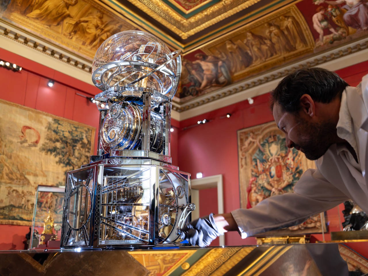 時を告げる瞬間が訪れる。本来は一日に一度だけ作動する仕組みを、この展示のために毎時間、手動で稼働させる。ゼンマイをわずかに巻き上げ、ヴァシュロン・コンスタンタンの彫刻師が厳かにその儀式を執り行う。ルーヴルの展示室は、神聖な機械が生命を得る瞬間を目撃する舞台となる。