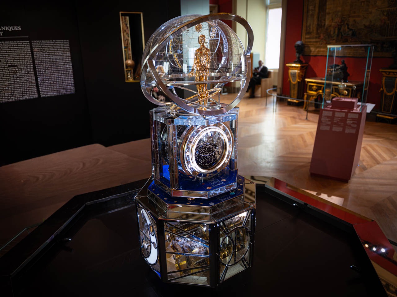 スポットライトに浮かび上がる「La Quête du Temps」。透明な構造と煌めく金属光沢は、まるで宇宙空間に漂う人工衛星のようでもあり、同時に古代から続く天球儀の現代的再解釈でもある。ルーヴルの展示室の中で、時間そのものが宙に浮かんでいるかのような錯覚を与える。